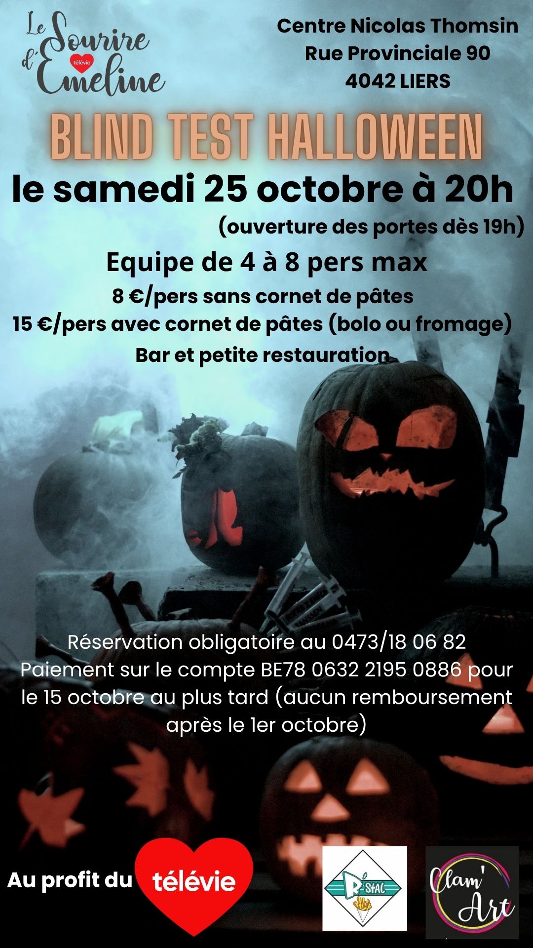 Le paiement conditionne la réservation (BE78 0632 2195 0886 – aucun remboursement après le 1er octobre) avec le nom de l’équipe + choix de pâtes en communication.