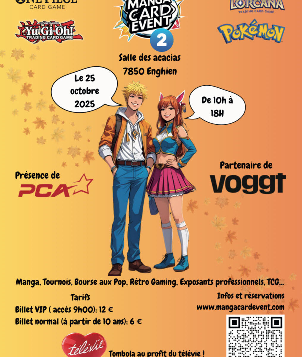 Lors du MangaCard Event d’Enghien, une tombola sera organisée au profit du Télévie (avec des lots de cartes, mangas, figurines, … à gagner) ainsi qu’une vente aux enchères de cartes Pokémon.
