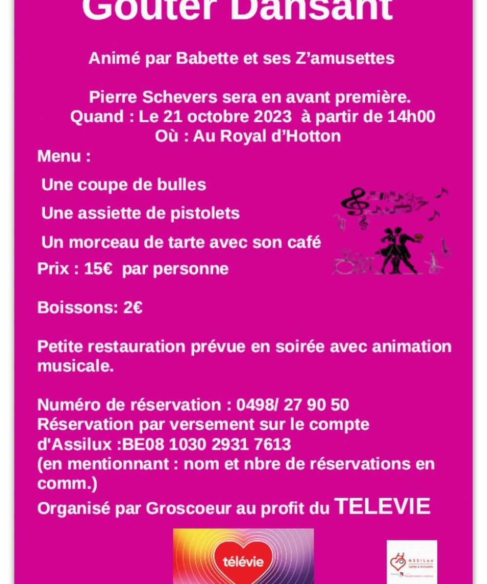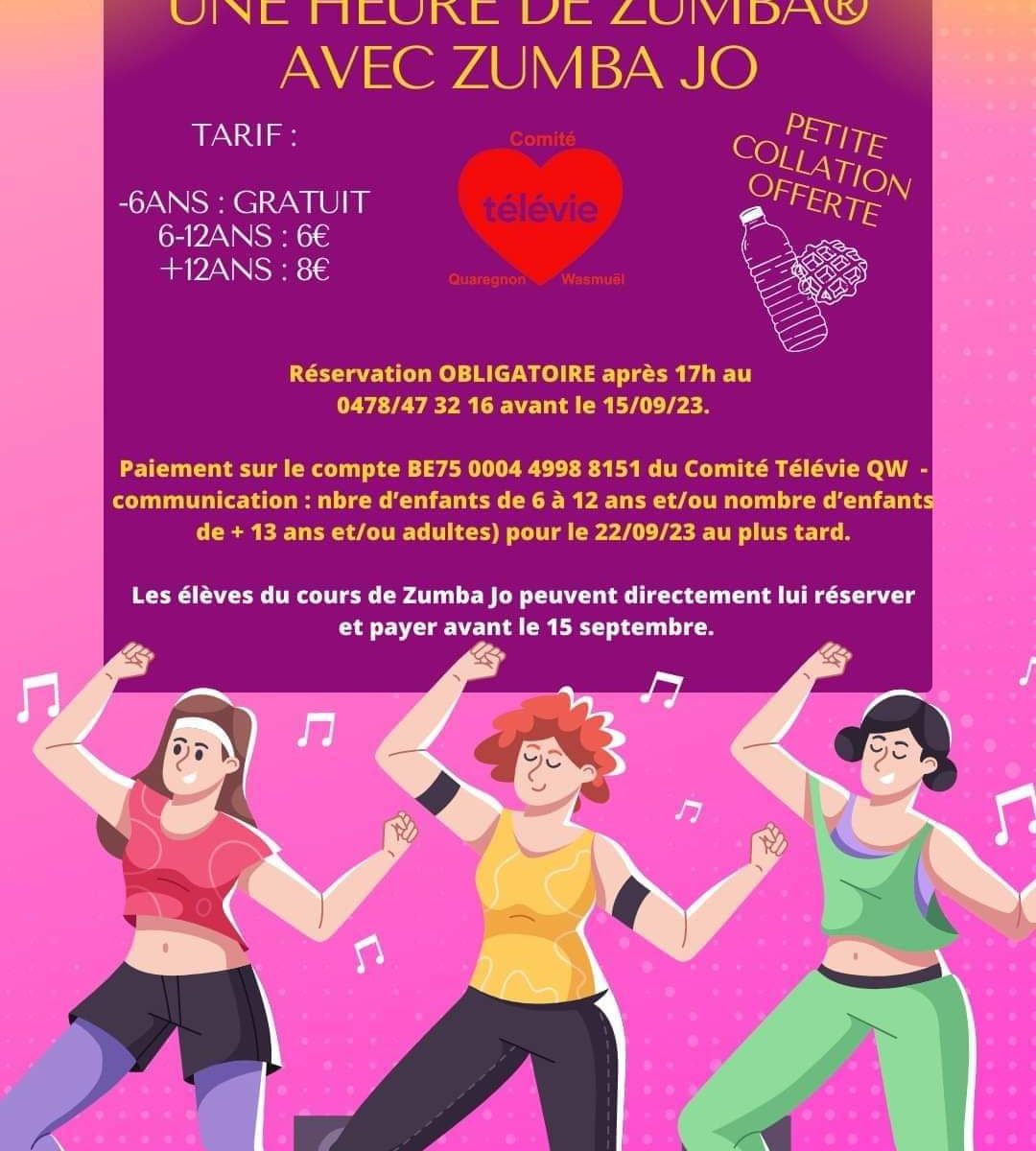 Réservation obligatoire auprès du groupe Zumba Jo (pour les personnes qui connaissent Johanna) ou au 0478/47.32.16 (après 17h) avant le 15 septembre.