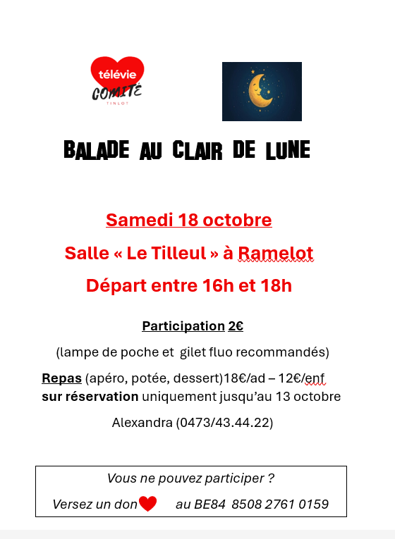 Souper sur réservation (apéro, repas, dessert). 18€/adultes – 12€/enfants.
