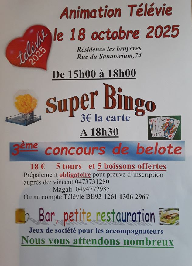 A 18h30 : 3ème concours de belote (5 tours) – participation : 18 € (5 boissons offertes).