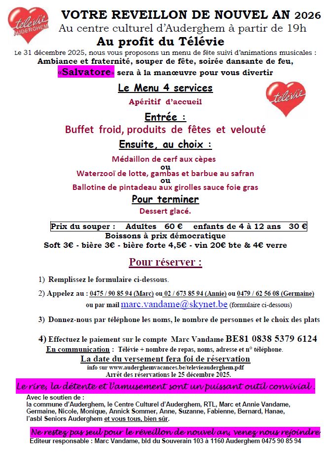 Réservation au 0475/90.85.94 ou televieauderghem@proximus.be
