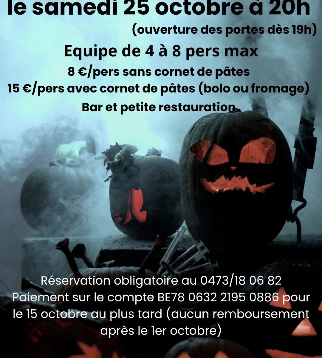 Le paiement conditionne la réservation (BE78 0632 2195 0886 – aucun remboursement après le 1er octobre) avec le nom de l’équipe + choix de pâtes en communication.