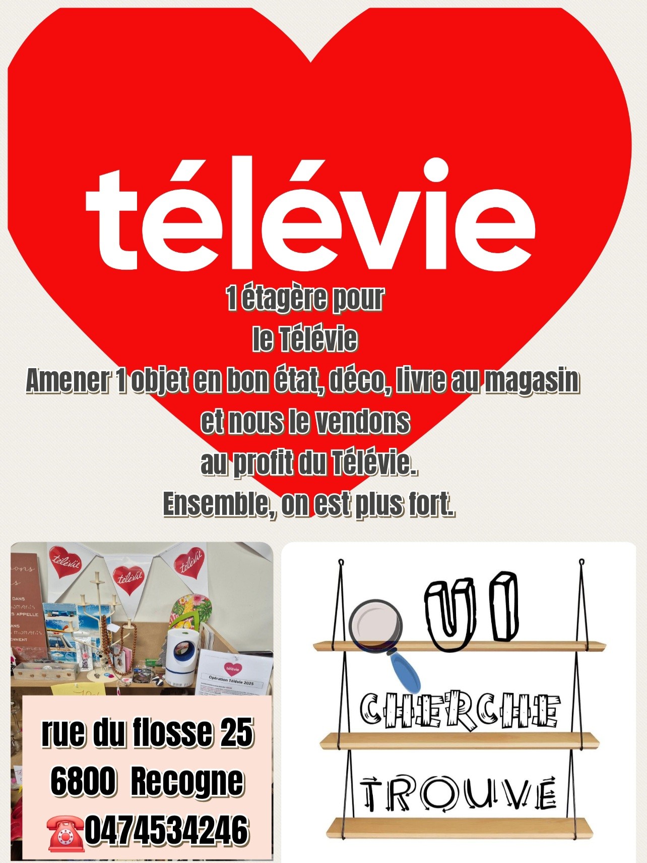Pour la 3ème année consécutive, le magasin « Qui cherche trouve » à Recogne/Libramont met une étagère à votre disposition au profit du Télévie.