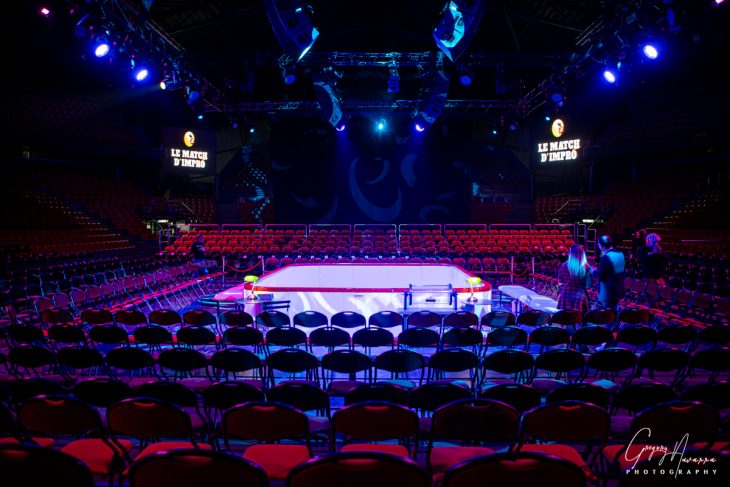 Un match d’improvisation est un spectacle où deux équipes – ici, une équipe de la Ligue d’Impro et une équipe de RTL Belgium – s’affrontent dans une véritable “patinoire” d’impro.
